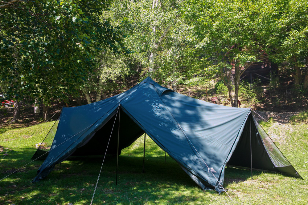 4人程度の利用をイメージしたマリポサ M。2本のメインポール+2本のサブポールを使いながら、四隅を落とし込むことでタープの有効面積を大きく保つことに成功している。