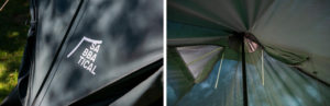 左/ロゴのレイアウトも非常にシンプルでクール。製品全体を通じて、シックにまとめる大人の落ち着きを備えている。右/ワンポールテントの頂上部。しっかりした補強の他、開閉可能なベンチレーターを装備。そのベンチレーターのスライダーには操作用のロッドが設けられ、2mを超える高さのベンチレーターも簡単に開け閉めすることが可能にしている。