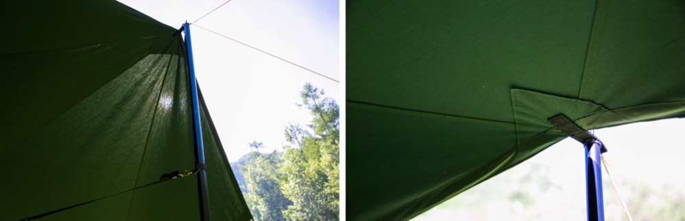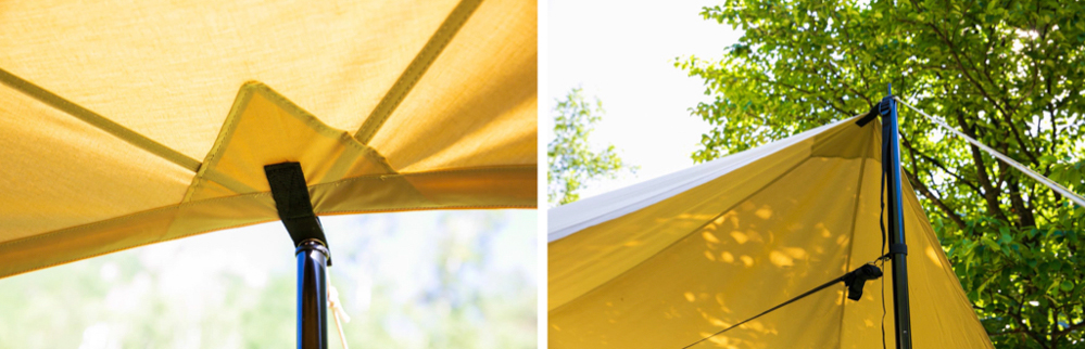 左/ポールの受け部分はテープと金具によって補強。突然の風に煽られても、トラブルに繋がりにくい頑丈さを誇る。右/ランタンハンガーとして機能するハンガーテープ。高さを調整できるだけでなく、3つのリングを備えることで好きな場所にランタンを吊るすことができる。