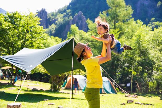 ■エクスパンダーペグ スプリングスチールの反発力で地中で大きく広がる特殊なペグを手に「お、これ、けっこう効く」と伸也は満面の笑み。これで風が吹いても安心安心。