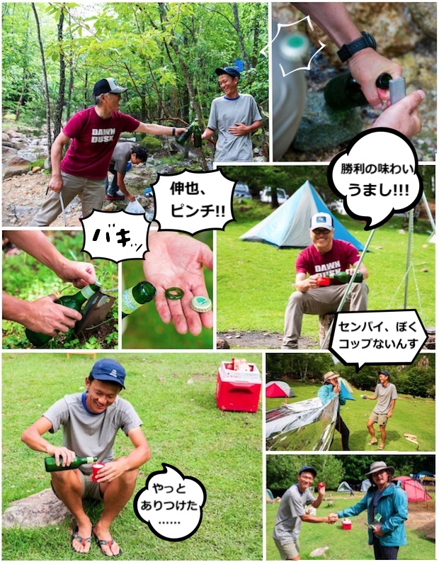 さて、雨も止んだので、そろそろ設営開始してください! と、伝えたのに、この人たちには馬耳東風。伸也と拓郎さんはそそくさと川へ。瓶ビールを手にしたふたりだが、栓抜きはないなずだ。どうする!? そんなことは関係ないでしょとばかりに拓郎さんは、ゲットしたファイヤースターターを取り出し、シュポッと見事に開栓。でも、伸也にはそんなものはない。では、と近くにあった鉄の支柱に王冠を引っ掛けて……バキッ!!! なんと瓶の口が割れてしまった! このままじゃ、口が切れちゃいます。そこで、伸也は思い付く。ジュンさんがコップをふたつ持っていたはず。センパイ、ぼくコップないんす。トレードお願いします! え!? まだ、設営始まっていないんですけど……。