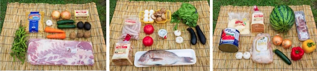 左から拓郎さん、伸也、ジュンさんが選んだ10食材。それぞれのメインは、豚バラの巨大な塊、めでタイ一匹、なぞのダック一羽分。このダック、いまはパッケージされていますが、開けてみてビックリの展開に。やっぱり持ってるなぁ、ジュンさん。