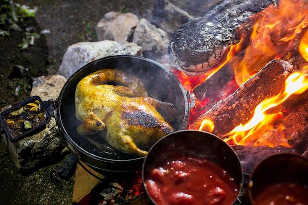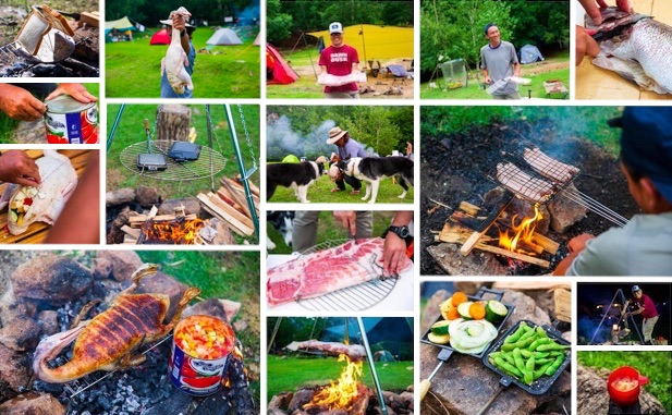 ジュンさんのダックはなんと首付きの丸ごと一羽。「マルコ」と名前を付けて、調理を開始。どうやらジュンさんはエセのイタリア人と化している模様。チャオ、トレビーノとラテン系の言葉を連発。いいから、ちゃんっと調理しましょうね! 拓郎さんは黙々と豚の塊に下処理を施しています。バッチリと塩を効かせて、刻みを入れて、熾した焚き火の上に設置したトライポッドにドサリと乗せる。ワイルドぉ〜。伸也はタイを3枚おろしにして、ブロイラーで網焼きに。ちゃんと皮を下にして強火で炙っています。ところで、気になるもう1匹のボーダーコリーは、伸也の愛犬モリコ。もう食材が気になって仕方がない様子で、全員の食材を本能丸出しでめぐっています。それにしても、コフランアイテムはやはり焚き火料理が似合うね。