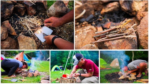 ■ファイヤースターター マグネシウムの粉を火花で着火させたら、細かく割った木から順々に大きい木へと火を移していく。拓郎さんはこれでビール瓶の蓋を開けていました。