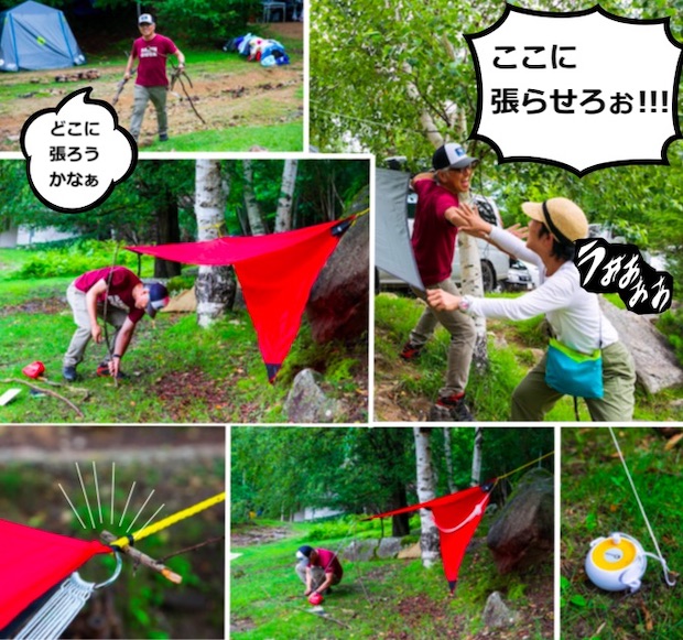 「ハンモックを掛けるいい場所がないなぁ」とキャンプ場内をウロウロする拓郎さん。ハンモックの設営はほどよい間隔の木立を見つけなければ始まらない。すると、“ある場所” を見つけ、少し考え込んでから一直線に向かって行ったのです。なんと! そこにはすでに、Akimama広告担当のハンモックが設置されていたのです。自分の場所が狙われているのを察知したハトリが「ヤメテ〜」と防御をしにくるも、無慈悲にどんどんと解体されていってしまう。ということで、まず無事(!?)に場所を確保。……と、いいたかったところですが、「やっぱ、ダメだ。木立の幅が合わないや」なんて言葉を残し、次の場所へと移動する拓郎さん。ひど〜い! でも、ここからは早かったなぁ。あっという間にハンモックを設営したと思ったら、小枝のみでピクニックブランケットを屋根にしてしまいます。拓郎さん曰く、ここが今回の寝床のポイントだそう。ヒモは一切使用せずにブランケットとハンモックをアタッチしていて、結ばずに小枝を使うことで、位置調整もスムーズに行なえる。こんなやり方があるなんて! あとは、拾ってきた木とランドリーリールでテンションを掛ければできあがり。ブランケットが不意の雨も防ぐタープに大変身。これだけの材料で雨も防げる寝床がつくれるって想像できました? アイテムを選ぶ段階でここまで考えていたなんて脱帽です。