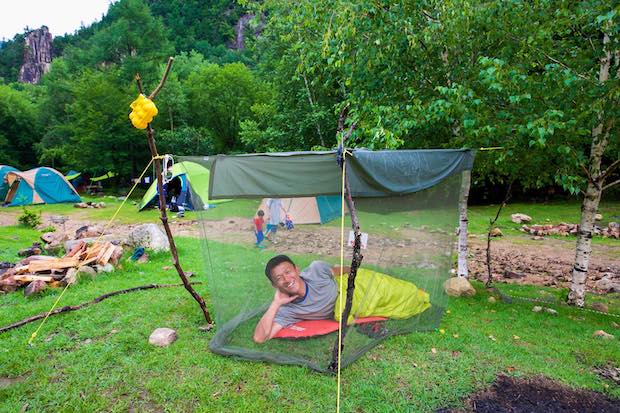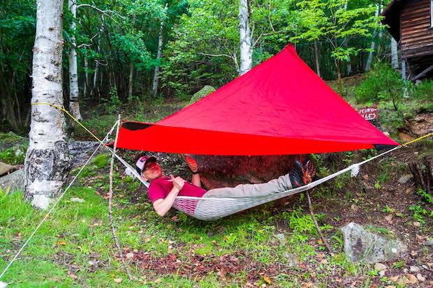 前編をじっくり読んでいる読者なら拓郎さんの考えがわかったはず。持参した自前のコクーン「Insect shieldトラベルシーツ」。これで虫への対策ができているので、なんの迷いもなくハンモックを選んだのです。ほかのふたりとちがい、空中に浮いた状態で寝れるため、大雨が降って浸水してしまう心配なし。さらにはムカデなどの地面をはうタイプの毒虫にもやられない。難点をあげるとすれば、やはり不意に落ちてしまう危険があるってことでしょうか。真似をするなら、寝相が悪い人は要注意!