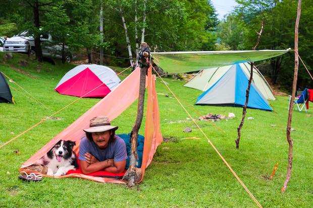 防水の布とロープがあればの宣言どおり、お手本のようなシェルターが完成。チューブテント本体と梁は固定せず、床を石で押さえてあるだけなので、石をどかせば梁を支点にして左右に簡単に動かせるのがミソ。大雨のときは差しかけたエマージェンシーシートの下に移動できるし、雨が吹き込む場合はシートの張り方を変えてやれば防げる。日中は日陰をつくり、ラナの避難場所にもなる。柱もしっかりしていて雨にも風にも強そうな一夜の宿となったが、唯一の難点はその素材感。夜、ライトを点けるとかなり色っぽいんです。中にいるのはオトコの中のオトコ……。
