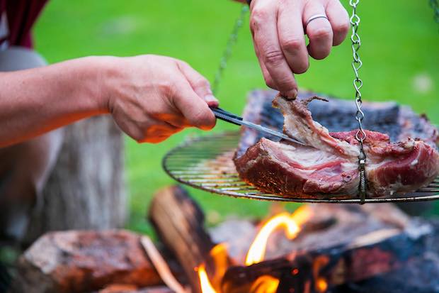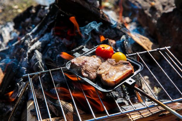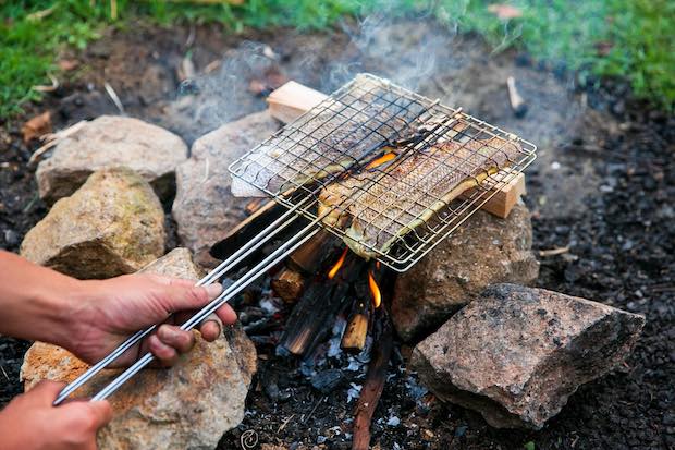 ■ブロイラー これひとつでなんでも焼ける。焚き火料理のメインアイテムともなる心強い存在だった。手にした瞬間に今日のメニューは決まっていた模様。