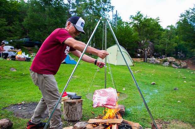 どうですこのワイルド料理。拓郎さん、「トライポッドで肉を焼く。これって男じゃないですか」とハナ息荒くなってます。中までしっかり火を通すために、あえて焦がしてしまうほど長時間じっくりと焚き火にかけた。その甲斐あって、外はカリっ! 中はジュワ〜の絶品ワイルドポークのできあがり。もはやジューシーなベーコンでしょこれ。スタッフ一同でペロリと平らげちゃいました。