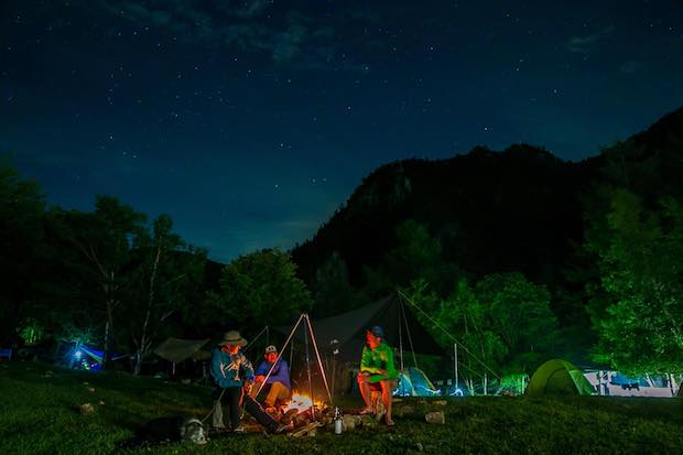 悪ノリで始まった企画は、アウトドアのプロ3人を迎えてさらに悪ノリに磨きをかけ、1泊2日のドタバタキャンプは終盤を迎えることに。こうして夜は更けていくのだ! 標高1,500mの高原の空には満点の星。眠れぬ日々の続いた暑い都会の夜から抜け出して、なんとも快適な一夜になりそうだ。でも、真夜中に大風が吹いて強い雨なんかがパラリと来てくれたら、もっとおもしろくなりそうだね、なんて外野は話しておりますが……。もしそうなったら、寒いだろうね、あの3人。