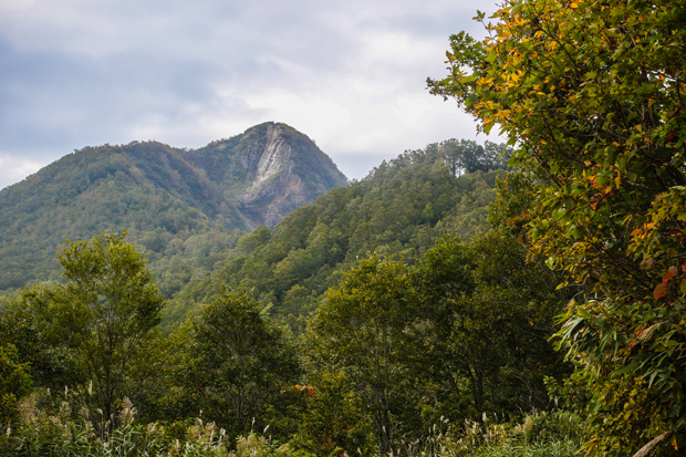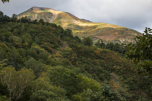 天気が崩れる気配のなか、ロッジからは五輪岳や雪倉岳が見えた。ときおり猛スピードで吹き流される雲の隙間から光がさし、紅葉が進む山肌を照らす。