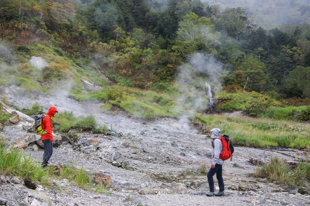 ロッジの裏手にある樹林帯の登山道から、野天温泉のある岩場のカール地形に向かって進む。前日に比べると紅葉も進んでおり、標高が上がっていることを実感する。小雨と強めの風に見舞われたが、これもインプレッションには最適。まさに望んでいた気候だ。前日の日差しを浴びた蒸し暑さとはまるで状況が変わったせいか着心地はいっそうよく、蒸れも感じなかった。