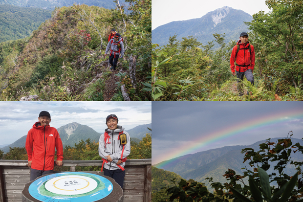 (上左)山頂に近づくと展望が開け、あたりが見渡せるエリアに。ただし、崖に注意。(上右)後ろには雨飾山。うっそうとした樹林帯を抜け、山頂まであと少し。(下左)山頂で記念撮影。このときは、まだ視界良好。展望台からは付近の山々もよく見えた。(下右)下山時に小雨が降り出すと、色の濃い虹がくっきりと浮かび上がった。