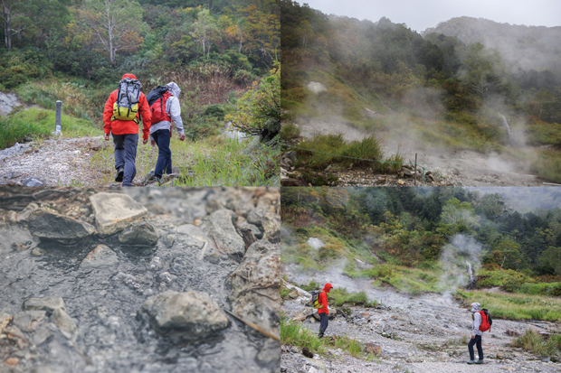(上左)小雨の中、標高を上げていく。(上右)硫黄の匂いと湯気が、辺り一面に漂う。(下左)地面から、ボコボコと温泉が湧き出してくる。(下右)雨の中でも、快適に行動できた。