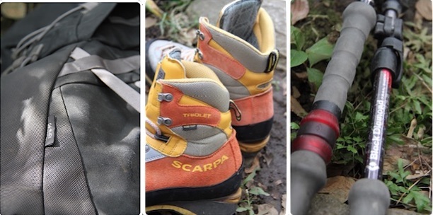 (左)大型のバックパックといえば、いまだマックパックの出番が多い。自重がとてつもなくあるけれど、その収容能力と背負い心地は文句なし。軽いモデルが多いいまとなっては、物好きか頑固者しか背負ってない!? (中)スカルパのトリオレは本当に履きやすい。すでにソールは平らで剥がれそうになっている。早く張り替えないと。(右)アンチショックモデルは多いですけどね、ブラックダイヤモンドのファジィーな具合がなんとなく手になじむんです。