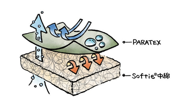 生地に使われているのはPARATEXだが、表地にはリップストップバージョンのPARATEX Micro、裏地には毛髪の1/10の繊維で作られ軽量で柔らかなPARATEX Lightが使われている。実際に触った感じも実にスムーズでかつ肌触りもいい。