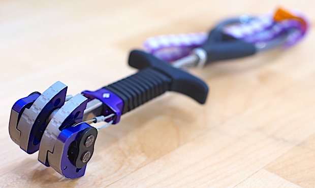 まず気になるところはステム周りではないだろうか。最初に目がいってしまう黒い蛇腹部分、ここは「リジッドフレックストリガー」と呼ばれる。ずらしてみると中には4本の細いワイヤーが通っている。このトリガーワイヤーを引きテンションをかけると、ステムが曲がりにくくなり、クラックへセットがしやすくなるというもの。セット後はテンションが抜け、フレキシブルで曲がりやすく、ウォーキングしにくい。