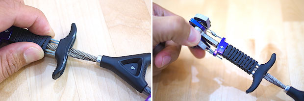 カムローブからのびるワイヤーにも細工がしてあり、オフセットクラックでワイヤーがたわむのを防いでくれる。