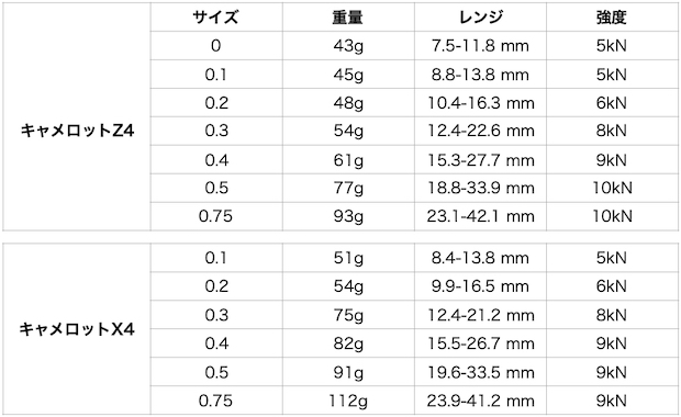 Z4とX4の重量・レンジ・強度ものせておこう。新作というだけあり、どのサイズもX4より軽量化がはかられている。そして、注目は「0」サイズだろう。C3で言うと000と同程度のレンジだ。重量も強度もZ4のほうがスペックが高い。