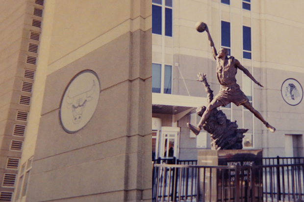 上)1996年のシカゴの街角。ビルと同じサイズのザ・ノース・フェイスの広告 下)NBA、シカゴブルズのホームコート。マイケル・ジョーダンのブロンズ像がある。