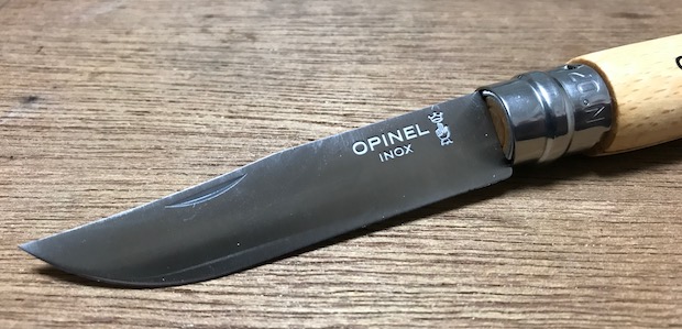 その反面、刃が薄いぶんオピネルのステンレスブレードは刃がこぼれやすい。というか、めくれやすい。刃が食い込んだ状態でこじるとすぐにエッジがめくれる。しかし、これを直すのも砥ぎの練習になるから、初めてのナイフにはちょうどいいだろう。