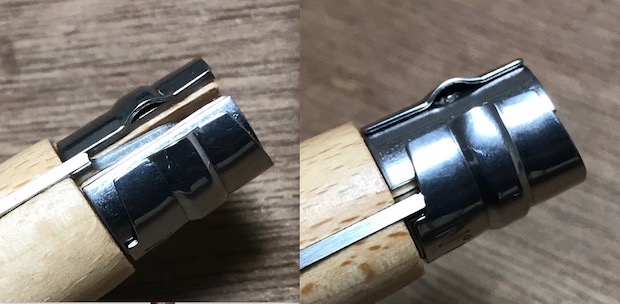 まず、シンプルな安全機構がいい。オピネルはブレードとハンドルの接合部にC型のリングが被せられている。このリングをスライドさせることで、収納時と展開時のそれぞれで、ブレードをしっかりロックできる。きちんとロックをかければ、ポケットの中で刃が開いてケガをする、なんてことがない。