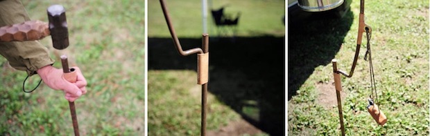 その特徴は、同ブランドならではの、細部まで作りこまれた機能美。ハンガーを地面に打ちこむ際、力の入る個所にはヌメ革のバンドが使用されており、また、ハンガーと地面に刺さる杭の連結部にはハンドグロメットを装備し、ランタンを2個使用することも、ライターなどの小物を吊すこともできる仕様になっている。さらに、ハンガー部分と軸となるアイアン素材の直径を変えることで、ハンマーで打ちこむ際の変形を避けて実用性を高めるとともに、一体感のある美しいデザインを保持させている。