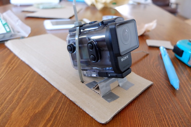 段ボール紙と結束バンドを使って簡易のカメラ台をつくった。