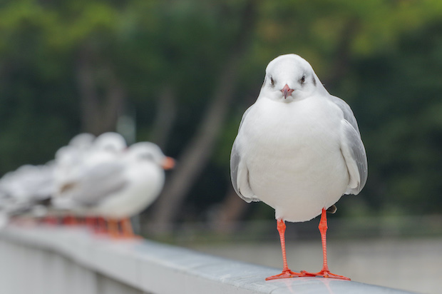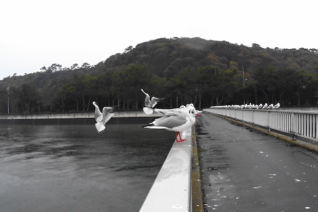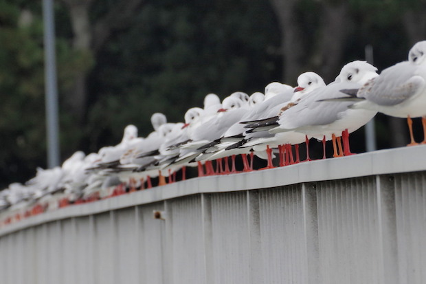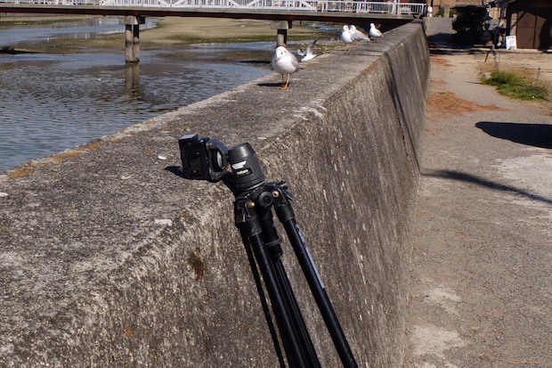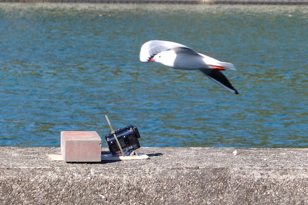 まずは、橋の欄干にセットしてみた。上の写真のようにユリカモメが密集して並ぶので、接近撮影は簡単そうだったのだが……。