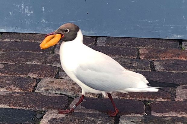 春をすぎるとユリカモメの顔は黒色に変わり、そしていつの間にか財田川から姿を消す。渡った先の北国では夏を満喫しているらしい。昨年の初夏、私はヘルシンキ(フィンランド)の港市場でこんな盗み食いを見た。