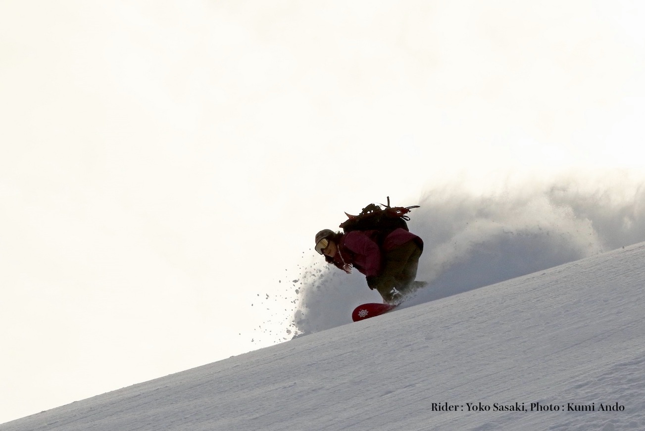 18歳でスノーボードを始めた佐々木さんは、選手時代はハーフパイプやスノーボードクロスのW杯を転戦し、冬季のソルトレイクオリンピックにも出場した経験を持つ。また今のようにバックカントリーがブームになる随分前からいち早く雪山に分け入り、フリーライディングの世界でも多くを過ごしてきた女性プロライダーだ(ちなみに中~高時代は器械体操で全国大会に出ていた。余談です)。
