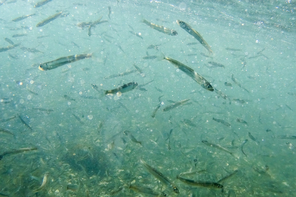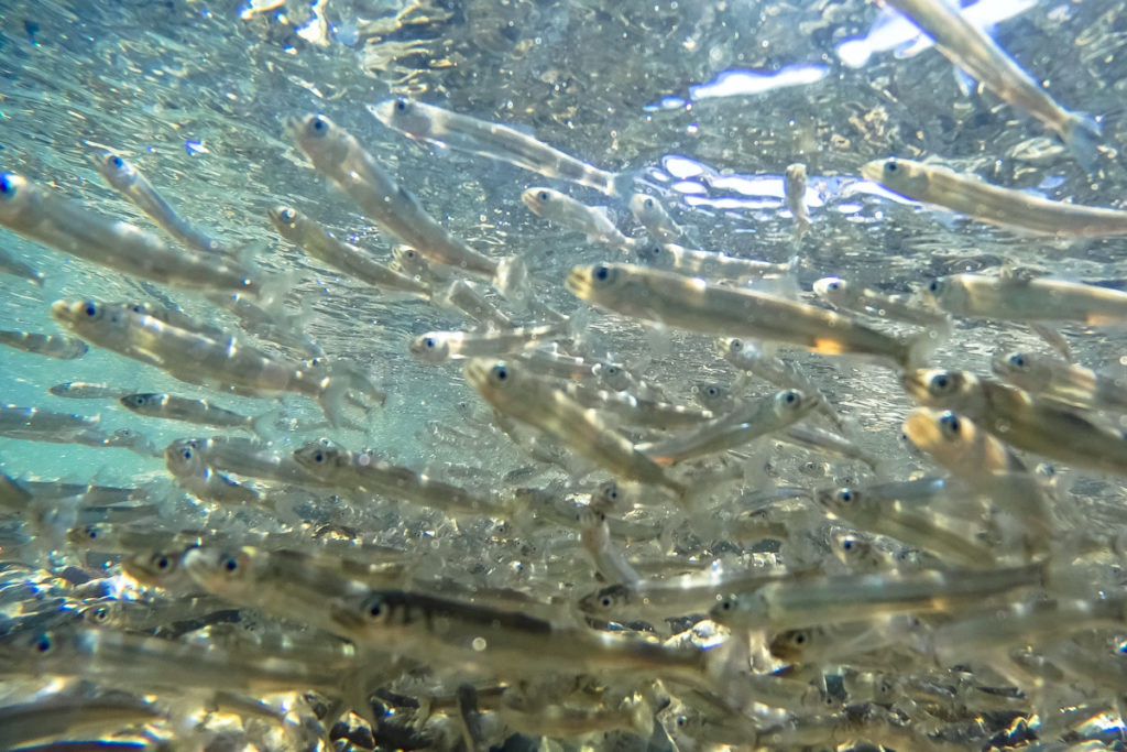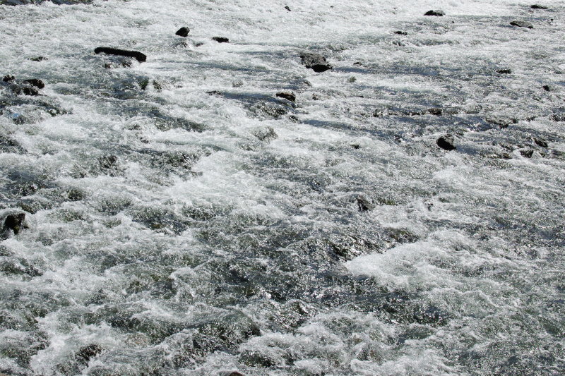 数は少ないけど急流をのぼるアユが。よく見ると、つねに必死に泳いでいるわけではないようだ。瀬のなかの岩によって流速に緩急が生まれ、場所によっては逆巻く流れもある。アユは水中でウエーブに乗りながら(水中サーフィンだ)、上流へと泳いでいく。
