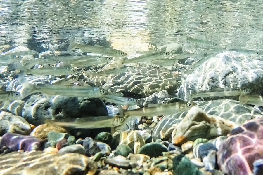 場所は傾斜した瀬の下の、やや緩やかな流れ。上から眺めると、黒い霞(ユスリカの蚊柱みたい)が形を変えながら水中を漂っている。今年もたくさん遡上しているようだ。