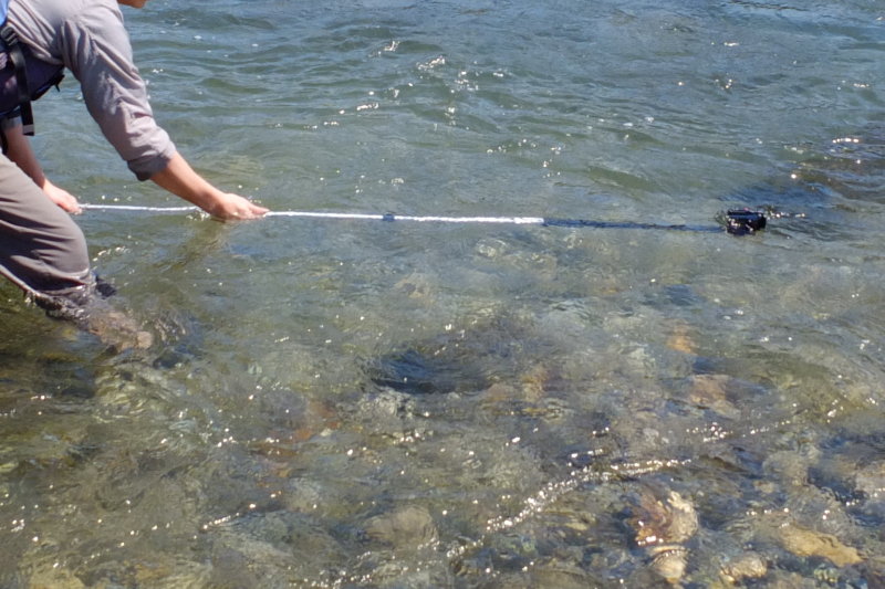 こんな感じでアクションカムを川底に設置。アユは気にしないようだ。