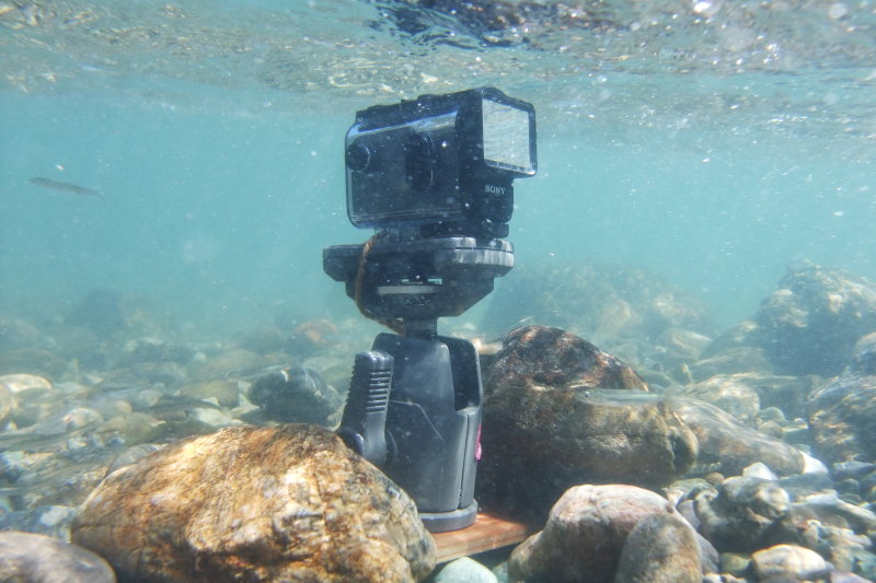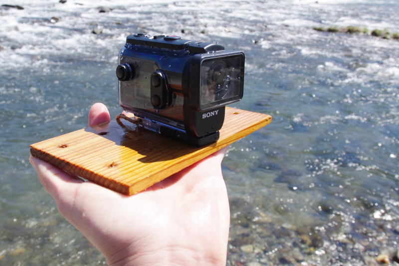 三脚からはずした雲台も、その多くが1/4インチのネジに適合するので、杉板+雲台+アクションカムも可能。このままでは浮いたり流されたりするので、板の上に石をのせて沈める。撮影設定を1秒間隔のタイムラプス、または動画にして放置した。