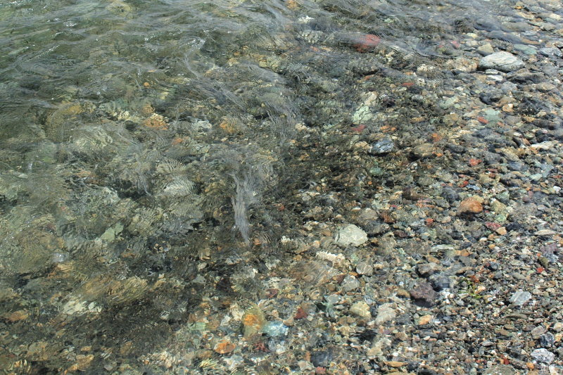 離れて見ていると3分ほどでアユの群れがもどり、アクションカムを囲んでいく。「こりゃいいぞ!」と期待したのだが、アユが近すぎてピンボケに。たいていのアクションカム(ウエアラブルカメラ)の最短撮影距離は30cmくらいなので、小さな生き物を接写するには何か工夫が必要だ(今後の課題)。接写と画質を求めるなら防水コンパクトデジカメを選ぶべきだが、アクションカムの画像でも楽しめないわけではない。