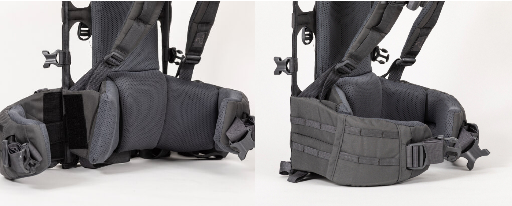 構造を示した左の写真を見てもわかるように垂直なフレームに対して、腰にあたるパッド自体に下向きの傾斜を持たせている。これは、パックがどんな状態でもウエストベルトがつねに腰回りに沿って固定されるための仕組み。