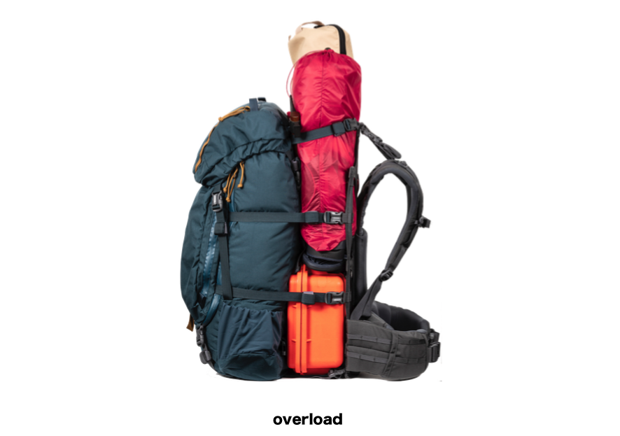 上記のガイドライトMTフレームなど、すぐれたフレーミング技術が生み出した安定した背負い心地があるからこそ、オーバーロード機能が成り立っている。オーバーロードとは、日本語にすれば「定員超過」「過負荷」といった言葉となるが、この場合は「プラスアルファの荷物を運ぶ」ための特別な機能ということになる。そもそもがハンティングやミリタリーなどでの必要性から生まれた技術であるが、山やアウトドアといった側面からの要望も多く、一般向けにも搭載されるにいたっている。