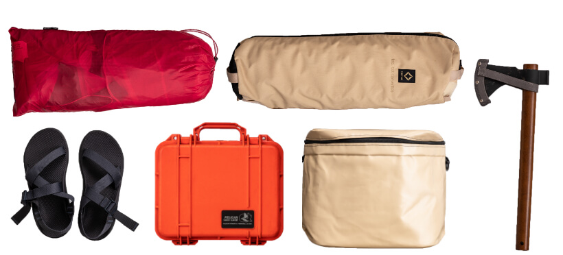 実際に撮影時に挟み込んでみたのは、ヒルバーグの2人用テント、ヘリノックスのコットにペリカンケース、チャコのサンダルにシアトルスポーツのソフトクーラ、ベアボーンズのハンドアックス。オーバーロードでは、これだけのものがきれいに収まってしまう。