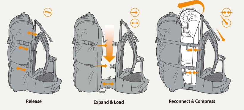 パック本体とフレームの結束は、バックルとストラップのみ。よって、オーバーロード機能を活用するときは側面と上部のバックルをリリースし、本体との間を左右に広げるようにする。空いたスペースに荷物を詰め、それぞれのストラップでコンプレッションを掛ければOK。(※テラフレーム65と80には、下部にもバックルあり)