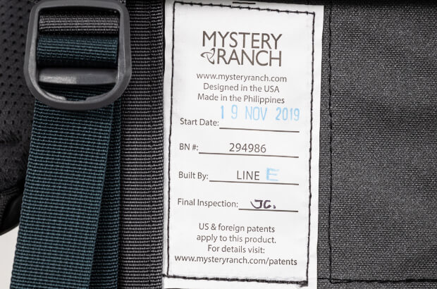 個体それぞれの製造にまつわる情報が記されている。ミステリーランチの徹底した品質管理を象徴している。