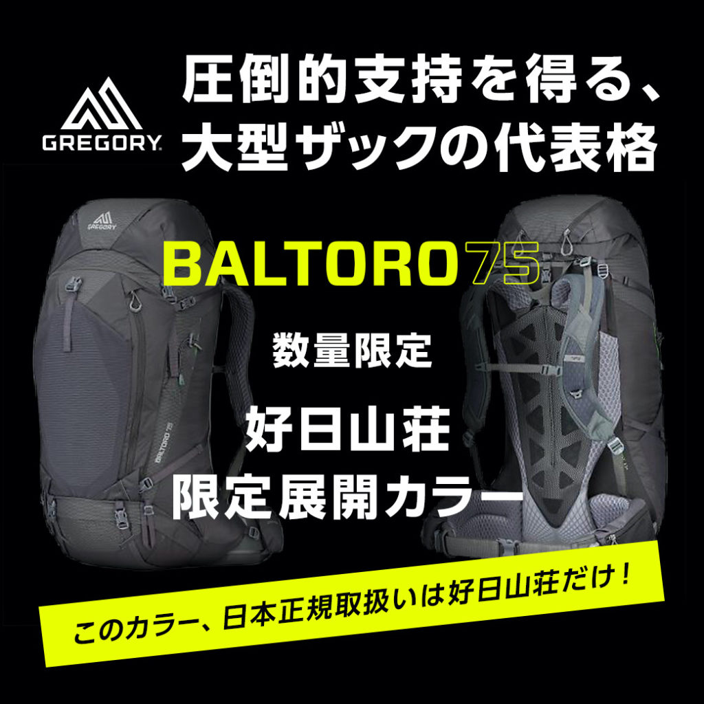 日本では入手できなかった限定カラーが、好日山荘限定で販売開始。なんの限定カラーかといえば、グレゴリーの看板モデル「バルトロ75」。黒系のトーンで配色されたシックな「オニクスブラック」である。