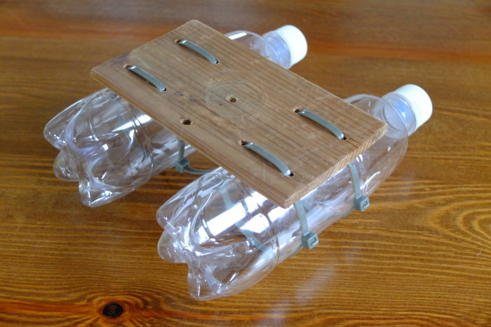 ①材料は、拾った杉板をノコギリで適当に切断したもの(長さ170×幅90×厚さ6mm)、ごみ箱にあったペットボトル(500㎖×2本、フタ付き)、呼び径1/4インチで長さ12mmのボルト、ひもか結束バンド。必要な工具は、中くらいの太さのプラスドライバー、モンキーレンチなど。