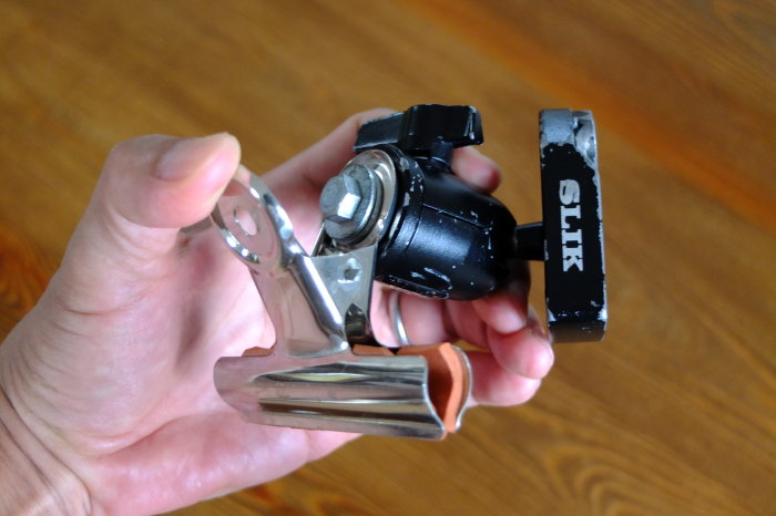 アクションカムのアクセサリー製品には「棒などを挟めるクリップ」がある。でも、そこそこの固定力でよいのなら、ずっと安いのが文具クリップ。たとえば、挟み口サイズ75mm(商品名は「目玉クリップ極大」というらしい)がそれで、100均で買えたような。これに、アクションカム用双胴小舟にもつかった自由雲台を取り付けます。