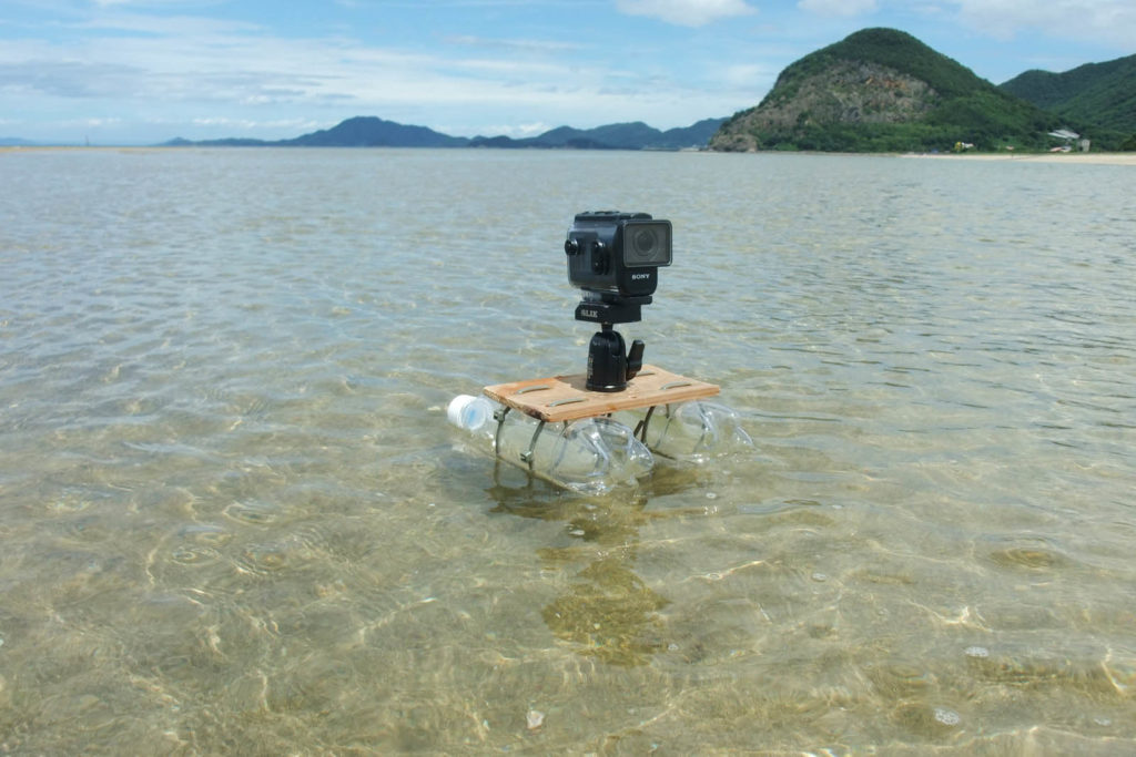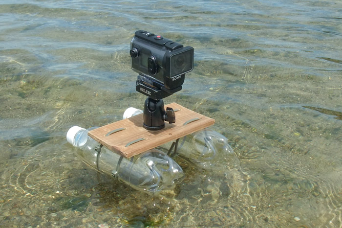 水面に浮かべて撮ればこのとおり。アクションカム用双胴小舟は波や風で回転するので構図を決めにくいが、それもご愛敬。