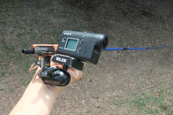 こんなふうにアクションカム+竿をセット。ブルートゥースを介したスマホアプリを使えば、アクションカムのアングルを確認できる。