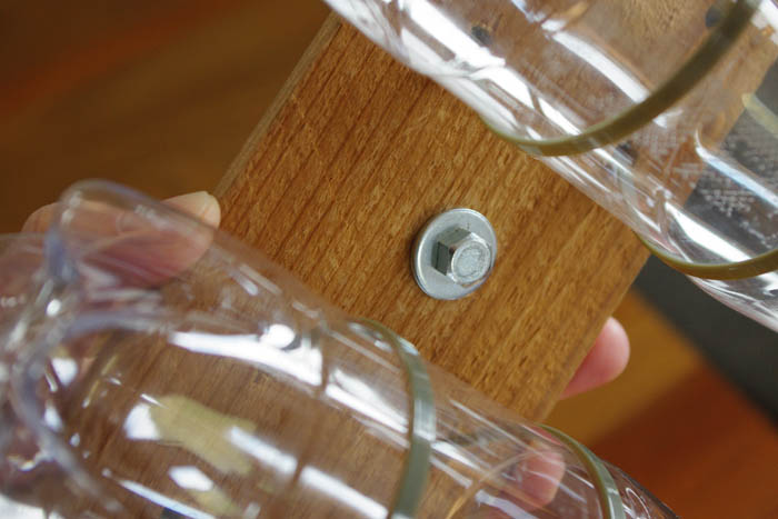 ②厚さ6mmぐらいの杉板だとプラスドライバーをゴリゴリねじ込むだけでも穴が開く。ここに結束バンドかひもでペットボトルを固定。