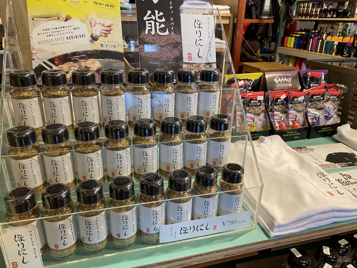 人気のあるアイテムのひとつがアウトドアスパイスの「ほりにし」。20種類のスパイスがブレンドされた万能調味料で、これ1本で味付けが完結する優れもの。