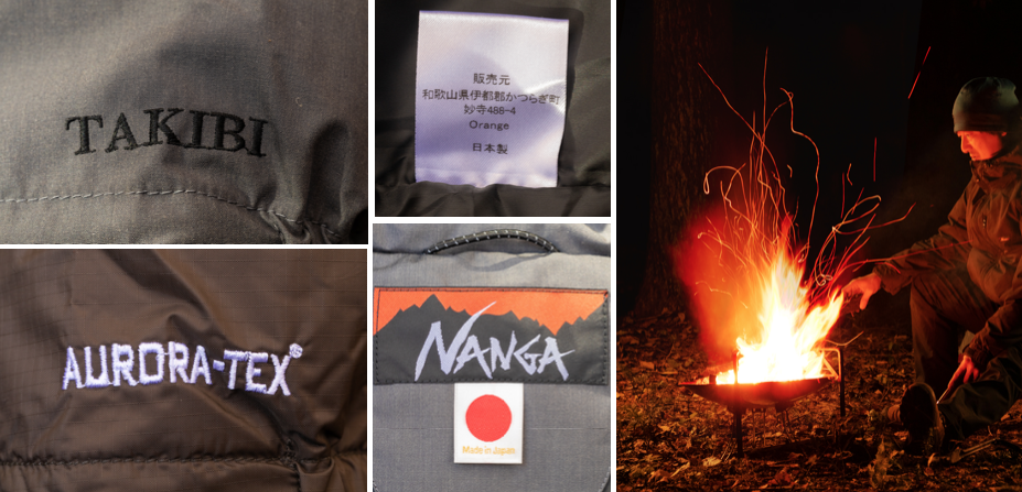 焚火ダウンジャケットの袖には「TAKIBI」の文字。そして、オーロラダウンジャケットの袖には「AURORA-TEX」の文字。焚火ジャケットの内側に付いている商品タグには、販売元としてOrangeの名が! NANGAとOrangeが手を組めば、派手な焚き火も恐るるに足らず。