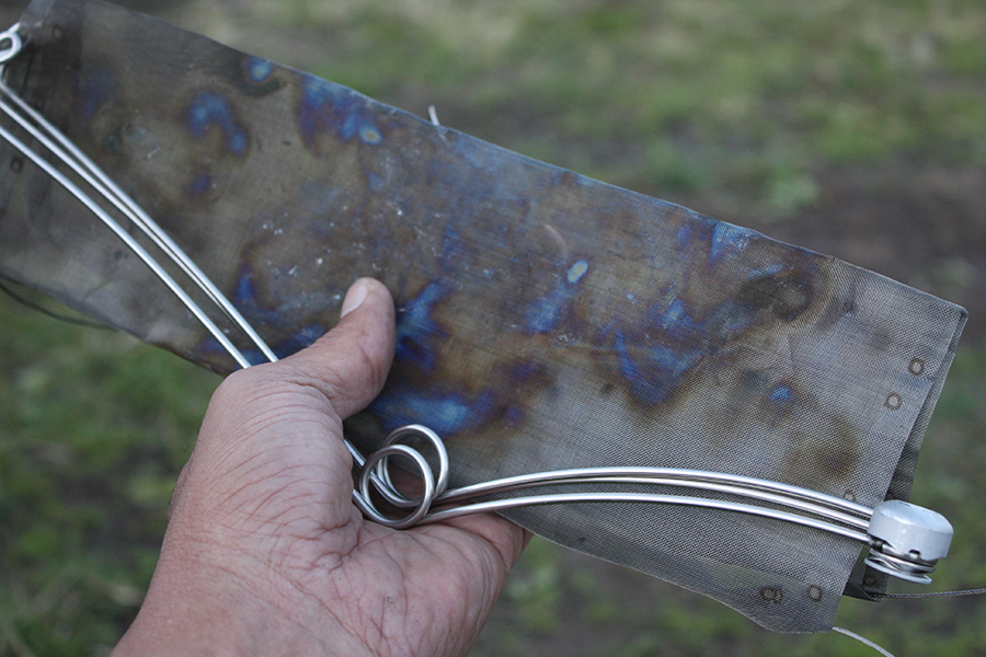 気になる地面への影響だが、ガンガン燃えているときに、真下の地面を触って調べてみた。多少は温かくなっているが下草が燃えるほどではない。熱伝導率の低いチタンメッシュの効能か。ただし長時間燃やした場合にどれくらい温度が高くなるかは検証していないので、地面保護の難燃クロスなどを敷いたほうが安心かもしれない。